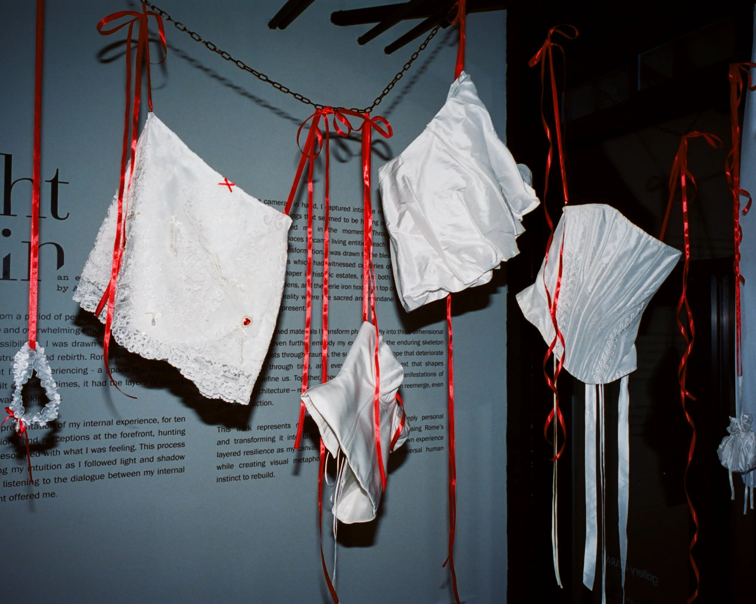 We hung new styles with red ribbon, allowing guests to step closer—to touch the fabrics, study the silhouettes, and see the intricate details up close.