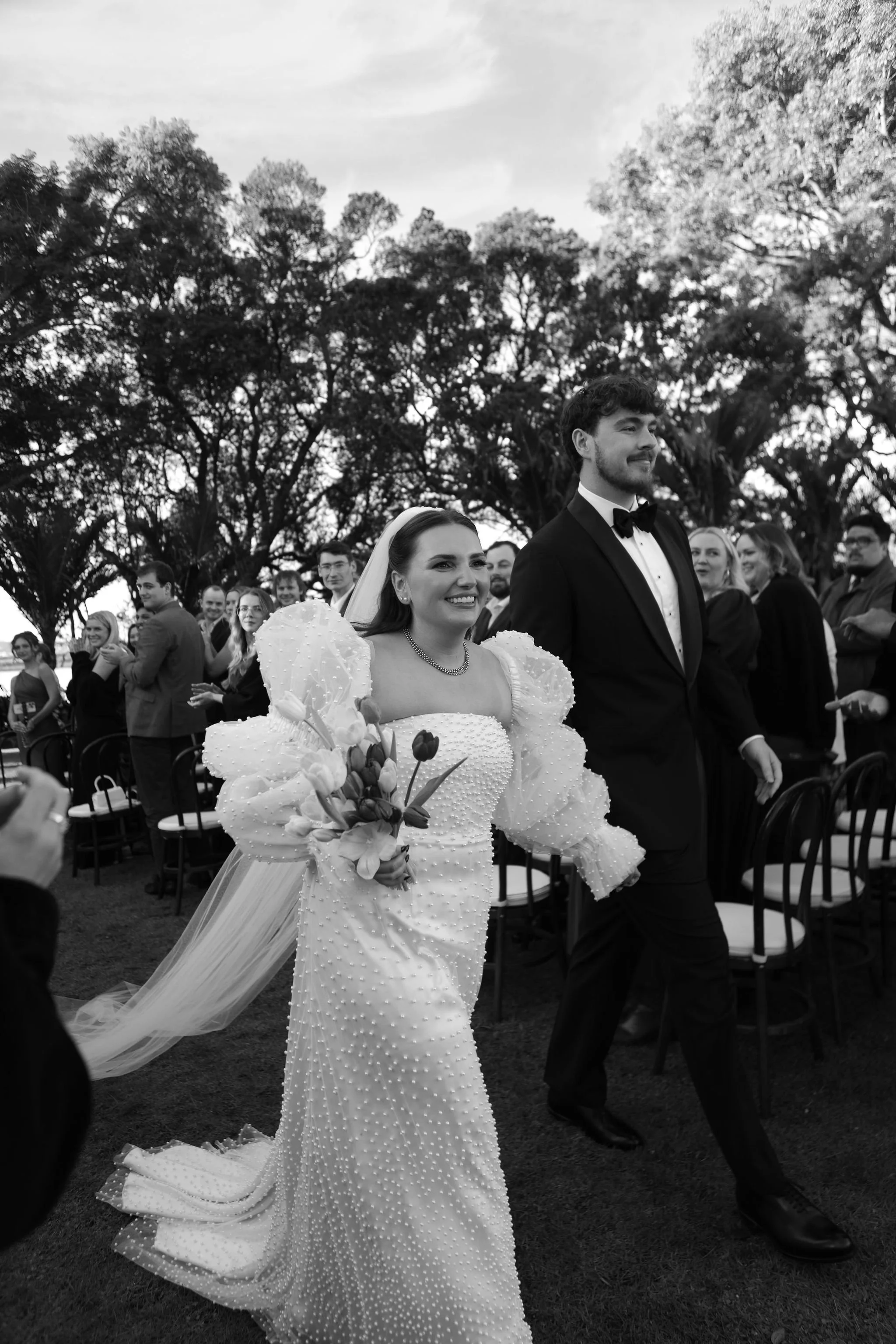 Leola in our Oasis Pearl Veil & gown purchased during our Prea James Trunk Show